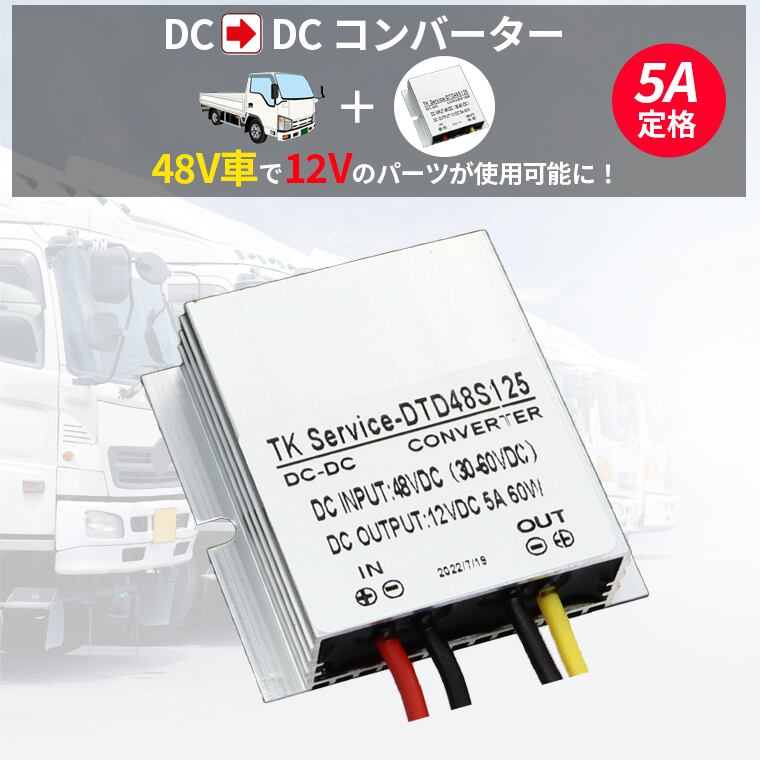 ■【製品特徴】大型車電源DC48V(30V〜60V)を電源(DC12V5A)に変換するDC-DCコンバーターです。※電圧30V〜60V以内なら12Vに変換することができます。配線はシガーソケットからの簡易型ではなく、バッテリーに直接接続するプロ仕様です。