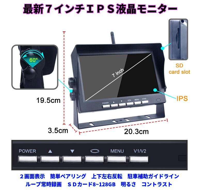 バックカメラモニターセット ワイヤレスバックカメラ 7インチバックモニター ドライブレコーダーとして使用可能 デジタル信号 12V/24V対応 ガイドライン表示 正像鏡像切替 ノイズ対策 高感度センサー IP69防水 2年間保証
