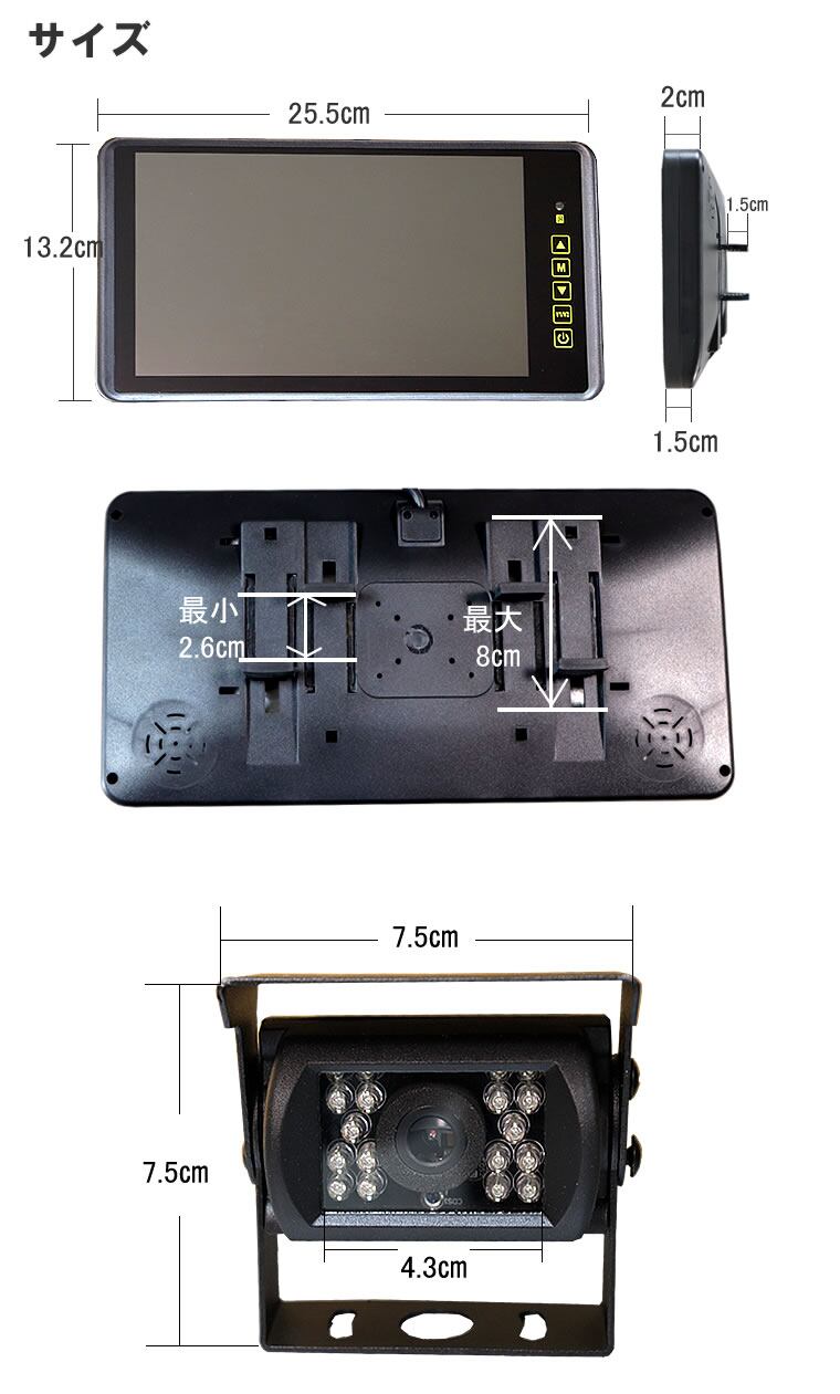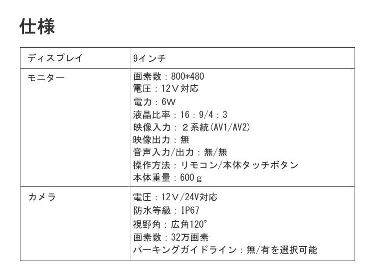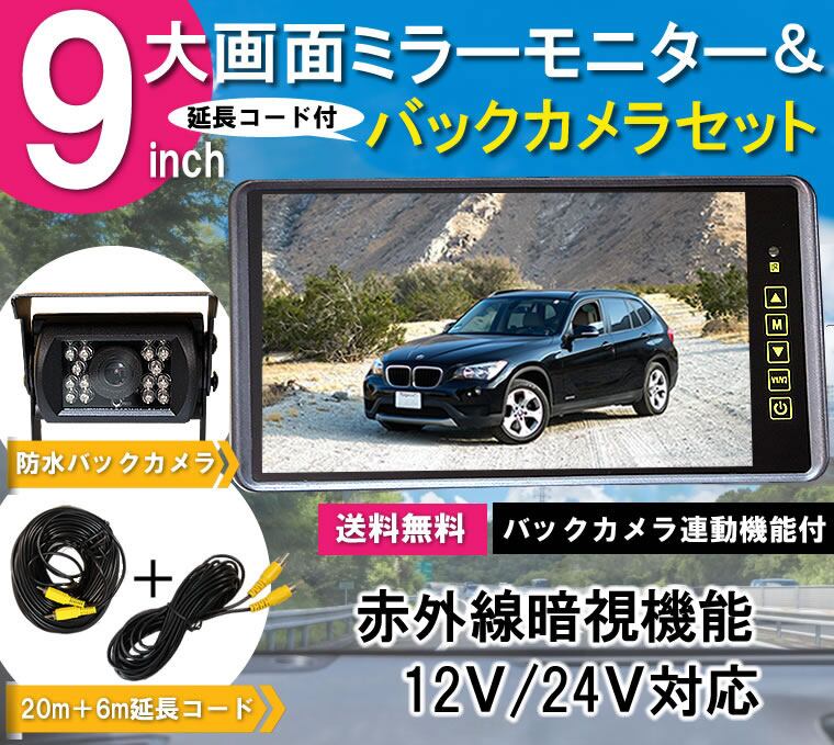 9インチルームミラーモニター(スリムタイプ)とバックカメラ、20mと6mの延長コードがセットになったお買い得商品です。