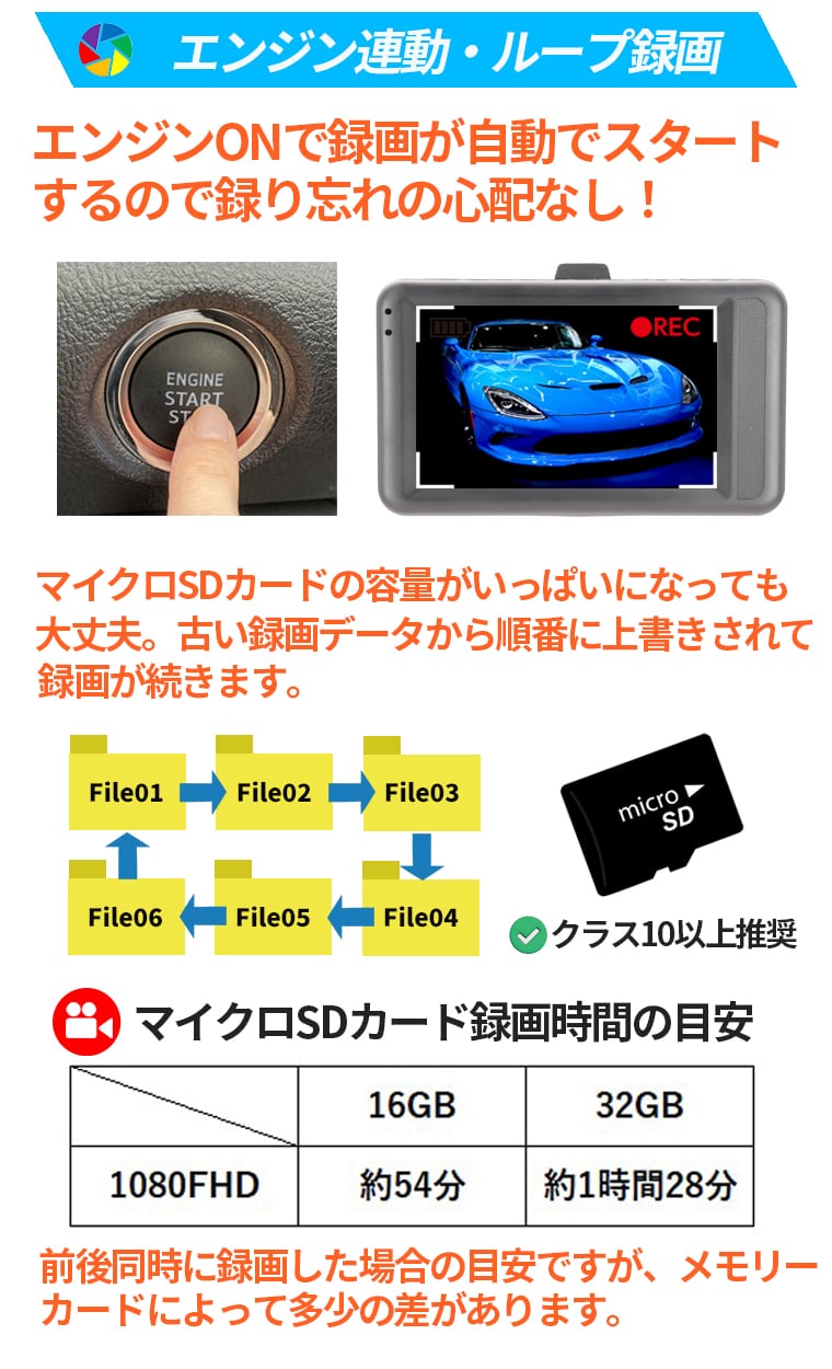 【主な機能】上書き録画、G-センサー、常時録画、駐車監視、動体検知