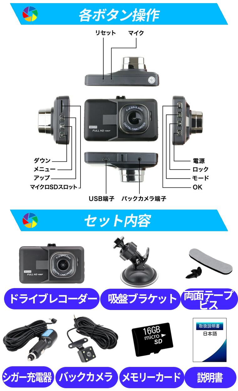ドライブレコーダー 前後 2カメラ 16GB メモリーカード 駐車監視 バックカメラ モニターセット IPS液晶 フルHD 高画質 1080P 広角120度 送料無料 日本語説明書