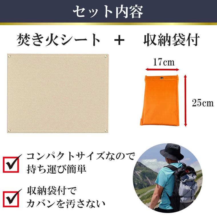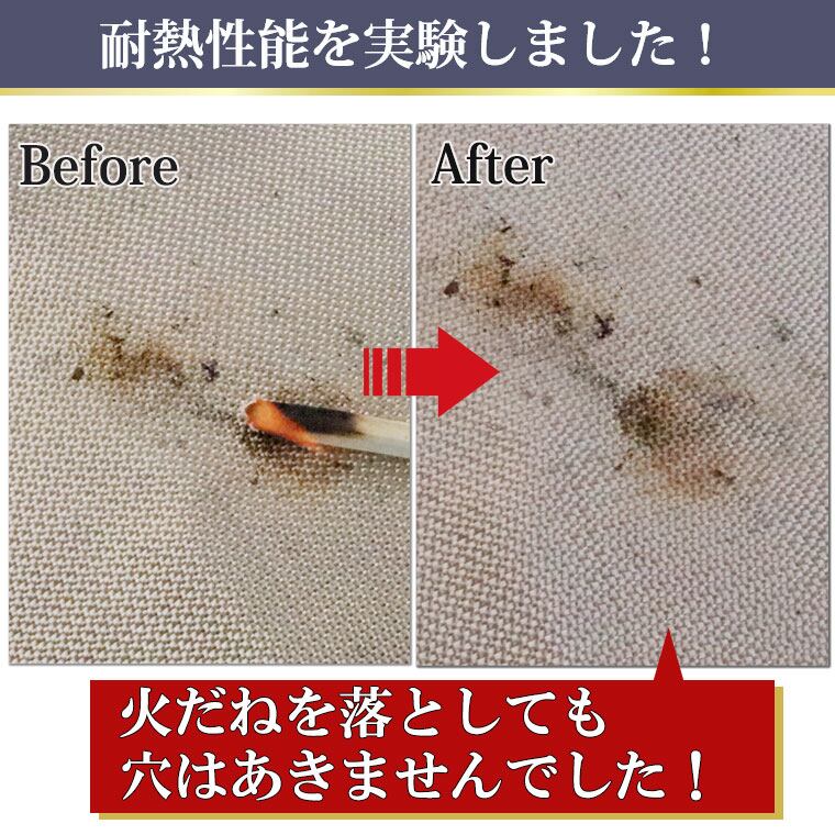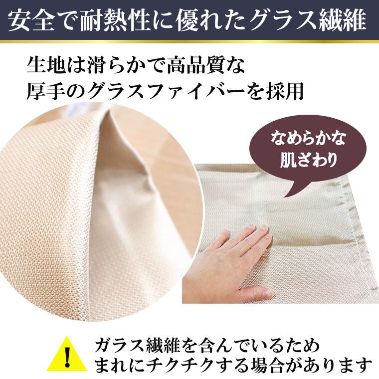 【ガラス繊維 】片面シリコンコーティングされた「耐炎化繊維」で耐熱温度は「1500℃」。地面へ伝わる「放射熱」を遮り「火の粉」や「燃えかす」がこぼれた時にそれを受け止めます。